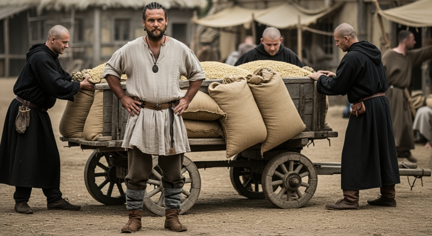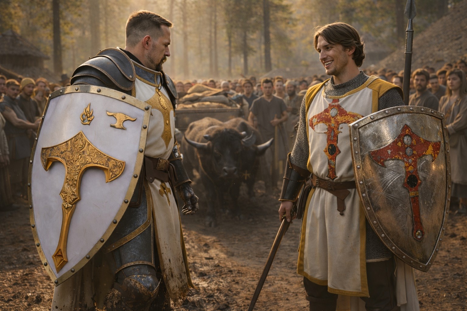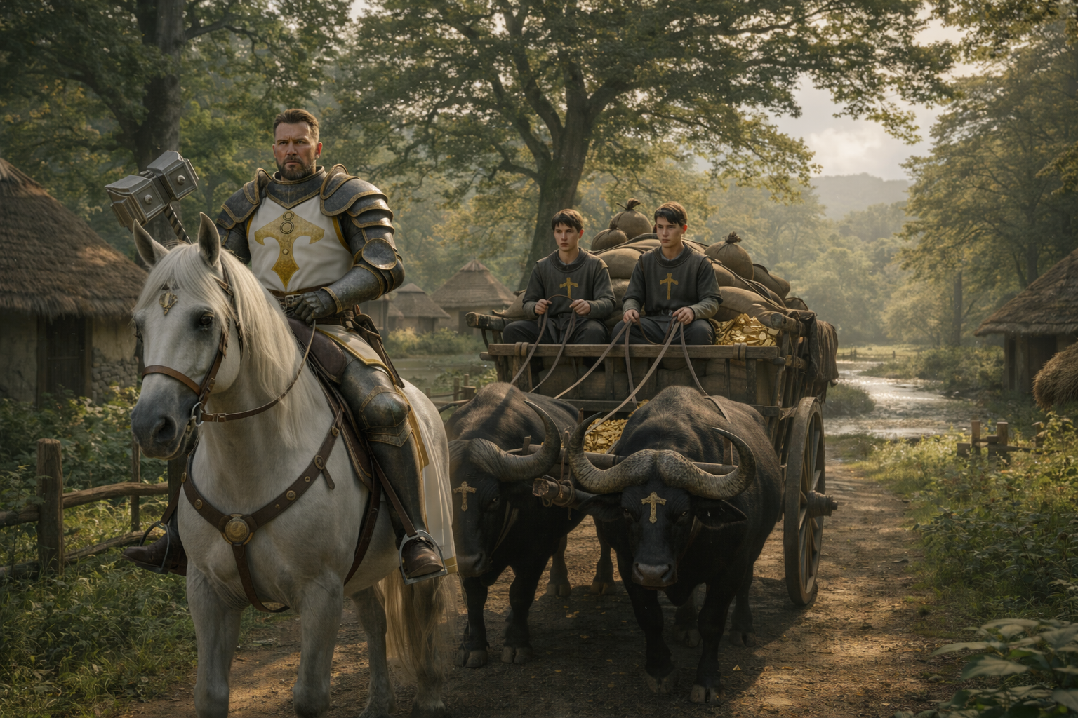 Es la tranquila mañana de Zamalis, el día consagrado a los guerreros de voluntad de hierro, aunque aquí el acero aún descansa en las vainas. Una carreta chirría pesadamente por los senderos, custodiada por Don Ulfvairn, Maestro Forjador de la Orden. No trae grano para los silos, sino el oro del Magister, la ciudad-monasterio donde la fe de los Caballeros se templa con fuego y disciplina.