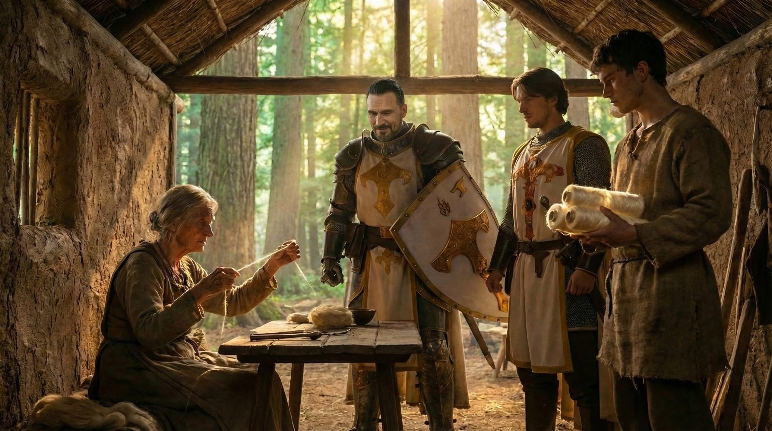 —Fíjate bien, muchacho —dijo Ulfvairn con voz grave y medida—. Te dije que en el interior no hay guerreros ni gente de armas, porque aquí reina la paz y los hombres viven de la tierra y el telar. Y sin embargo, aquí tenemos a un Caballero Edin. No porque la calma se haya roto, sino porque la Orden extiende su mano incluso donde no hace falta. Los Edin no duermen en puestos fijos; caminan por los caminos y los valles, y cuando el deber llama, responden aunque sea en un pueblo de telares.