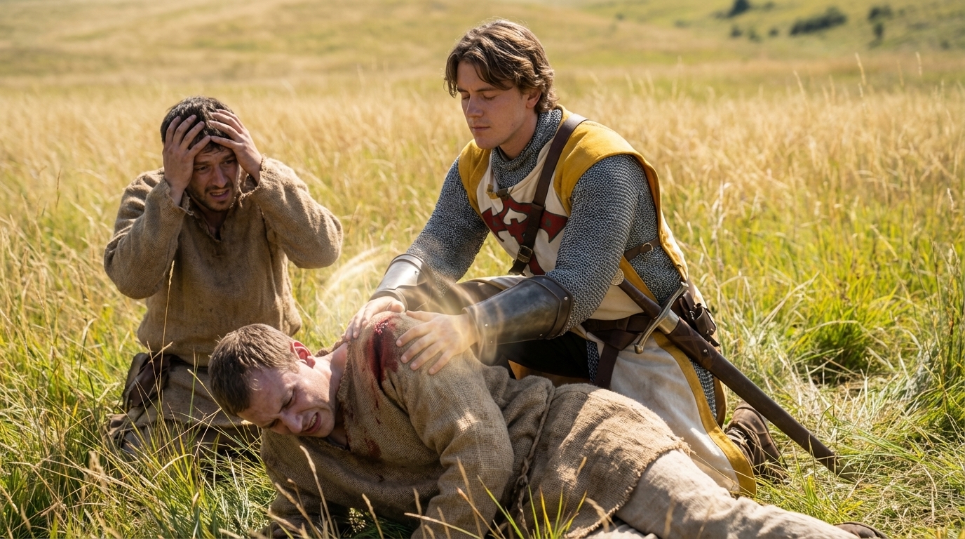 Un joven se había acercado sin que lo notaran, cosa que ya era en sí misma digna de atención. Su figura era espigada pero erguida, con el tabardo blanco y dorado de los Caballeros Edin limpio de polvo y camino, el gran Martillo de Thyr en rojo brillante sobre el pecho, escudo al brazo y espada larga al costado. Cabello rubio oscuro, ojos azules de una calma que no correspondía a su edad. Los labios, sin embargo, traicionaban algo: una sonrisa contenida, como de hombre que sabe más de lo que dice.