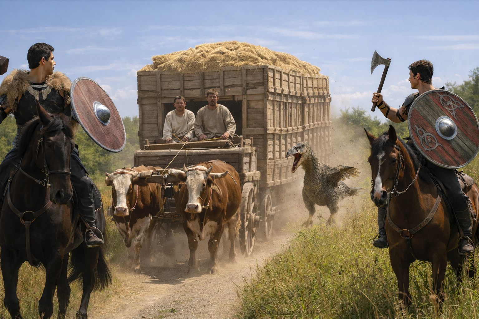 Lejos, a más de una hora de cabalgada hacia el sur, en los vastos pastos que se extendían antes de la densa ribera del río, otra escena se desarrollaba bajo el mismo sol. Una carreta de viaje, cargada hasta el tope con sacos de avena silvestre, traqueteaba apresuradamente, levantando una estela de polvo fino. Dos nómadas Aveneros de rostro curtido guiaban la marcha, sus ojos fijos en el horizonte del norte. No iban solos: dos Herthyr de La Secuoya los escoltaban, sus manos siempre cerca de las empuñaduras, sus miradas barriendo el horizonte.