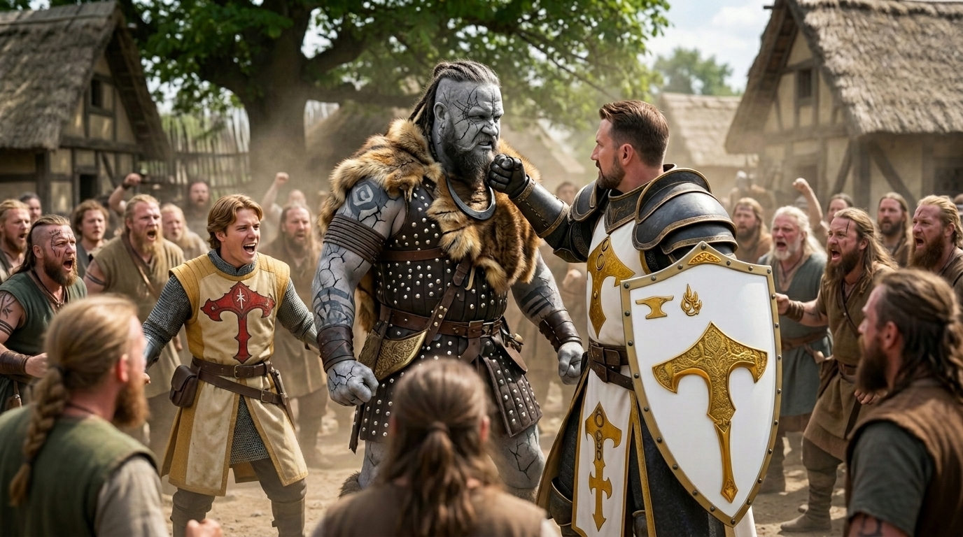 Mordeleg el Fuerte, el Dewafi guardaespaldas principal de Carantoc, apareció de entre las cabañas con la ferocidad de un toro. Gigantesco, con tatuajes rúnicos cubriendo su piel y la barba trenzada con anillos de hueso, vestía solo unas grebas de cuero tachonado y una capa de piel de oso, despreciando la armadura que otros codiciaban. Sus ojos, pequeños y penetrantes, ardían con una ira que no necesitaba palabras.