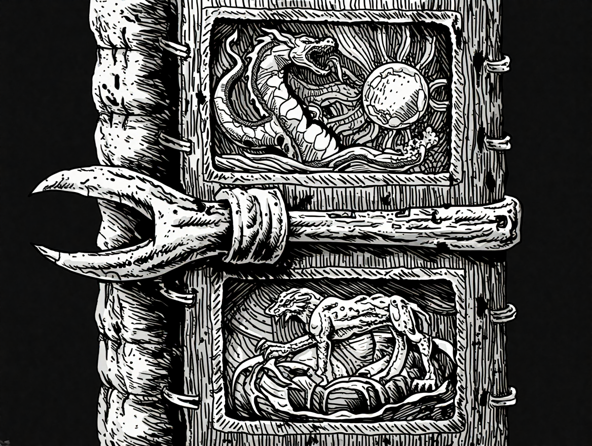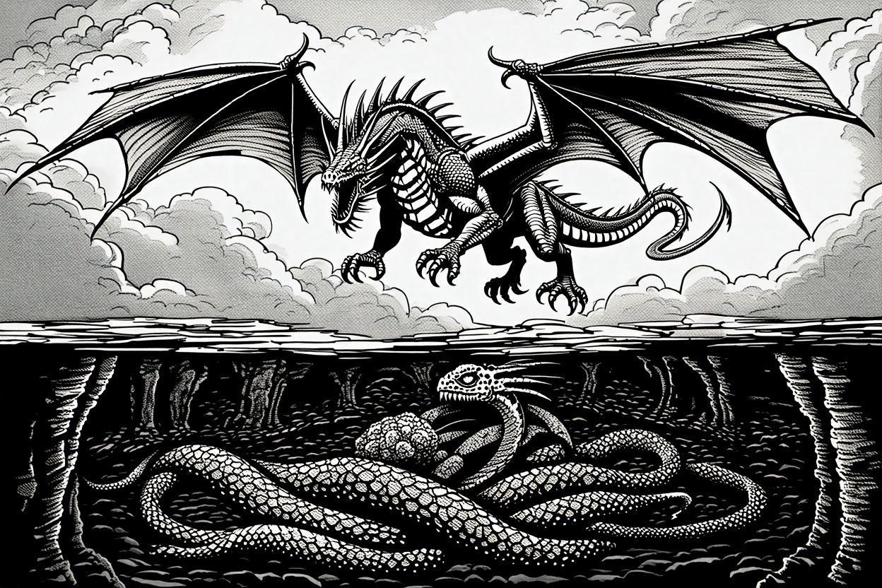 Shirama, la madre-gusano, crecía sin fin, minando las profundidades de la tierra como un cáncer en las entrañas del planeta. Cuando su tamaño rivalizaba con el de las propias montañas, su cuerpo se partía en dos. De una de esas mitades nació su primer hijo, el padre-dragón Mushussu, el rey alado de los cielos. Mientras la madre reinaba en la oscuridad de abajo, el hijo depredaba en la luz de arriba.